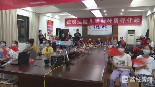 比赛开始前,梁馨枰的父母、教练以及淮安体校的游泳队员们,早早地就守在屏幕前,观看梁馨枰的比赛,在家乡淮安为她加油助威。当得知比赛结果的那一刻,大家都抑制不住内心的喜悦与激动,纷纷喝彩。