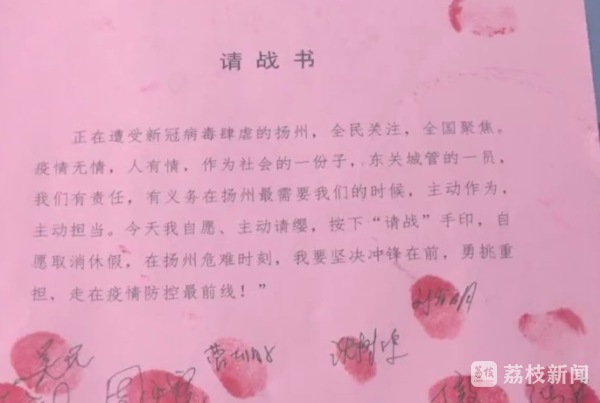 一纸请战书,是他作为党员的坚定:“大家都很积极,都在点上,队员都要求把这个请战书带到各个点位上,在现场签。东关10个检测点,我们每个检测点都有队员在现场维持秩序,包括后面运送医疗和基本生活保障物资。”