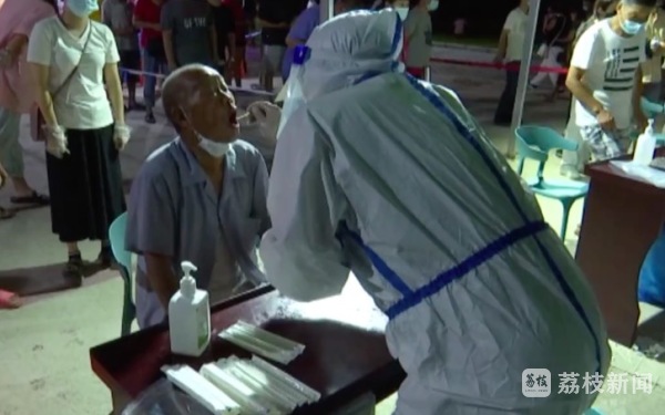8月7日晚上,在江都三友村党群服务中心核酸采样点,江都人民医院内科党支部书记杨永新做完汇报,再次换岗为村民们采样核酸。