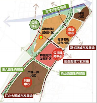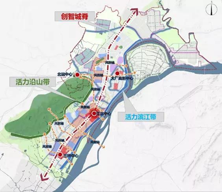 根据规划,江北新区直管区以江北大道为脊柱,打造活力沿山带与活力滨江带,江北、大厂、三桥、北站四大中芯,各条水绿廊道与新区紧密相间,构建山水活力、中心凸显、带轴互动的创新格局。