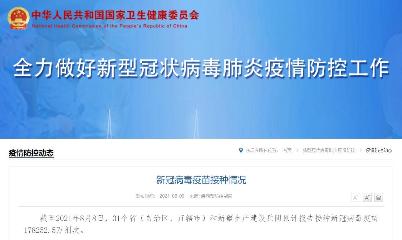 国家卫健委网站消息,截至2021年8月8日,31个省(自治区、直辖市)和新疆生产建设兵团累计报告接种新冠病毒疫苗178252.5万剂次。