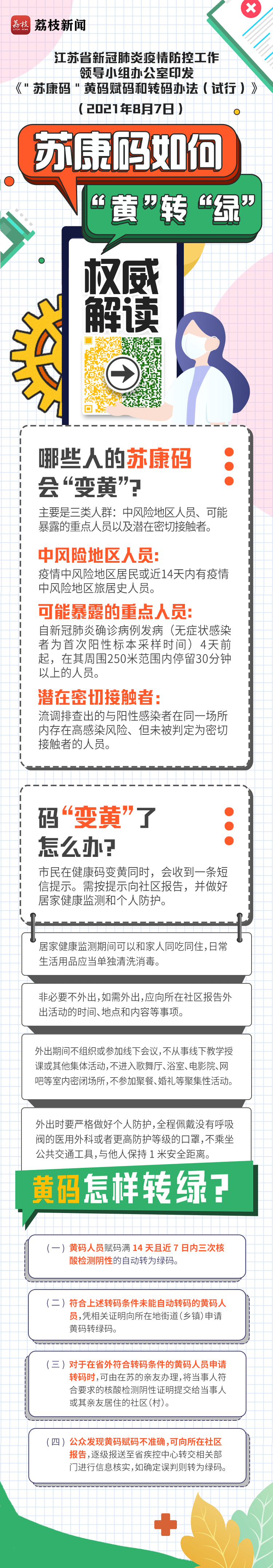 为进一步做好当前疫情防控工作,及早管控和彻底排查涉疫风险人员,江苏省新冠肺炎疫情防控工作领导小组办公室印发了《“苏康码”黄码赋码和转码办法(试行)》(下称“办法”)。该办法就黄码人员定义、赋码、黄码转绿码等问题作了具体规定。哪些人的苏康码会“变黄”?黄码如何转成绿码?一起来看权威解读。