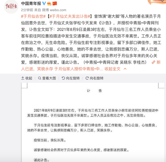 2021年8月9日凌晨3时左右,于月仙与三名工作人员乘坐小客车前往阿拉善拍摄途中发生交通事故,于月仙医治无效不幸离世。工作人员正在救治之中,无生命危险。于月仙生前专注影视事业,留下多部口碑佳作,她工作勤勉、热心公益、心地善良,她的不幸去世,让我感到悲痛万分,斯人已逝,笑貌永存。疫情当前,丧仪从简。诚挚感谢社会各界对于月仙多年来的关心关爱,感谢影迷的厚爱。谨此讣告。