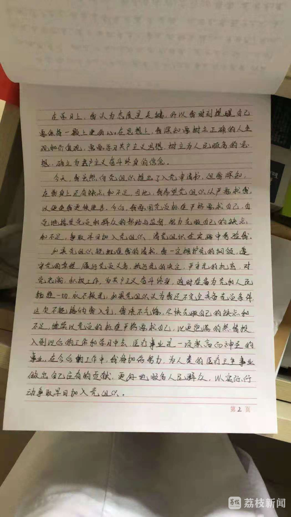徐景告诉记者,她没有想到自己在防护衣上写下“我要入党”的照片会在朋友圈刷屏,更没有想到媒体报道后,会有那么多群众为她点赞,给予支持。“看了大家在新闻上的评论,我有了提笔书写入党申请书的勇气。”徐景说,她在新闻评论中看到了很多老党员对她的肯定,大家纷纷留言“支持”“同意”,“谢谢大家的厚爱。”