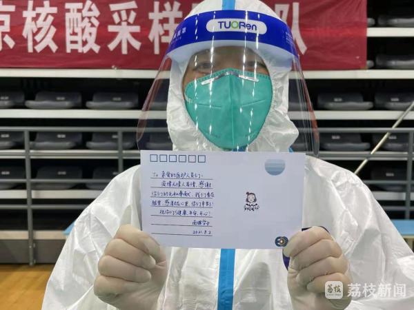 8月2日,在南京理工大学核酸采样点,医护人员还收到了一份特殊的“礼物”——一位署名“南理学子”的市民,在采样结束后,留下一封明信片。明信片上写着:“亲爱的医护人员们,疫情无情人有情,感谢你们的无私奉献,我们看到眼里,感激在心里,你们辛苦了!”