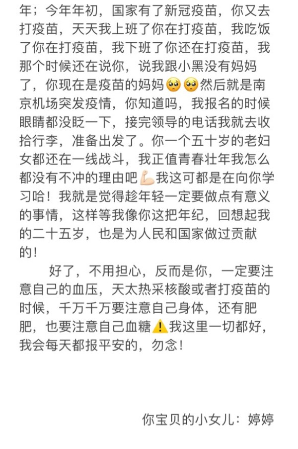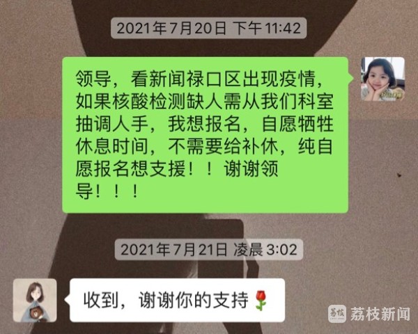 7月20日深夜,新闻中得知禄口机场出现了疫情,我躺在床上,辗转反侧,怎么也睡不着,我拿出手机在对话框里打下了这段今生都不会后悔的话:领导,看新闻禄口区出现疫情,如果核酸检测缺人需从我们科室抽调人手,我想报名,自愿牺牲休息时间,不需要给补休,纯自愿报名支援!!