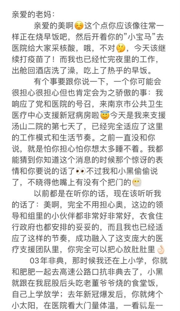 因为妈妈也是在一线抗疫的乡镇医生,近来很忙。今天出舱后看到妈妈的三个未接来电,我决心告诉她实情,我已经成功适应这里的工作模式和节奏,我可以保护好自己,于是我写下了这封给妈妈的家书: