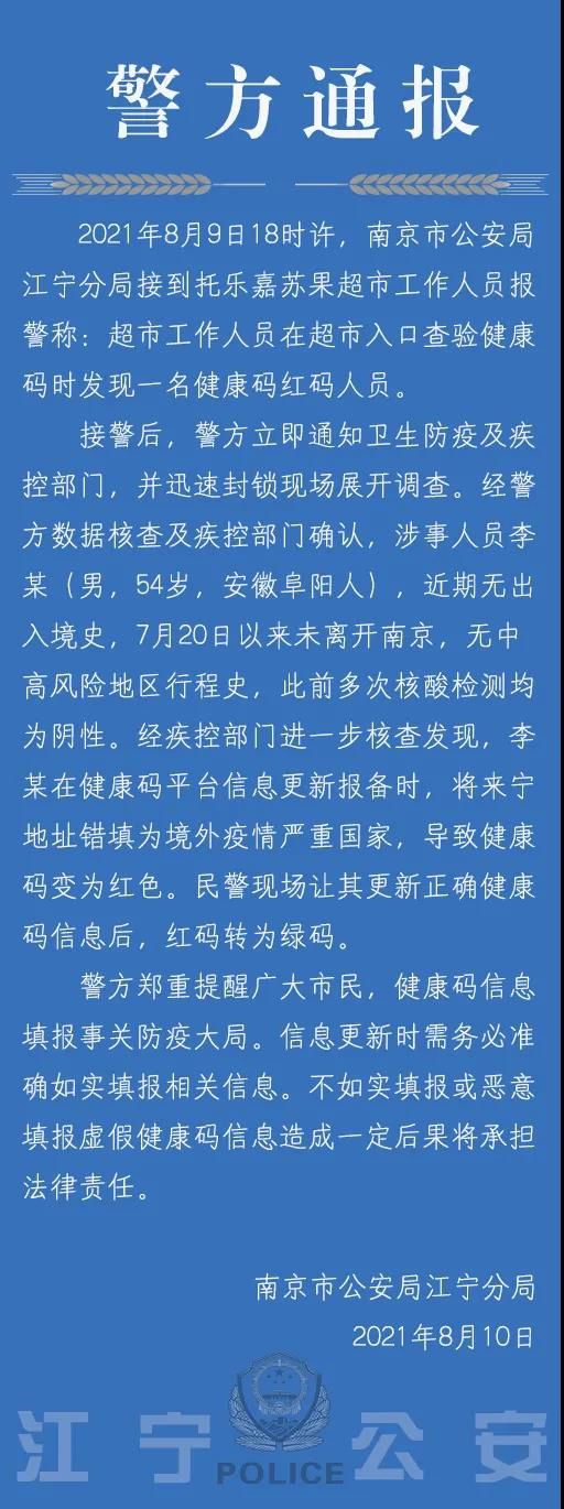 我苏网讯 据南京市公安局江宁分局8月10日凌晨消息,2021年8月9日18时许,南京市公安局江宁分局接到托乐嘉苏果超市工作人员报警称:超市工作人员在超市入口查验健康码时发现一名健康码红码人员。