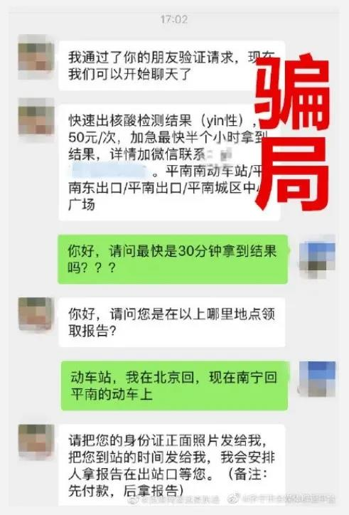 近期,部分市民报警反映一些社交软件群里出现“快速出核酸检测结果,加急最快半个小时”、“家里也能做核酸检测”等信息,只要额外付费便能做快速核酸检测。这是典型利用疫情防控实施的诈骗行为,诈骗分子声称有所谓的“私人渠道”,诱骗受害人先转账再查收核酸检测报告。在此提醒大家,不要轻信网络不实信息,这不仅可能影响自身健康安全和正常出行,更有可能落入诈骗分子非法敛财的骗局。