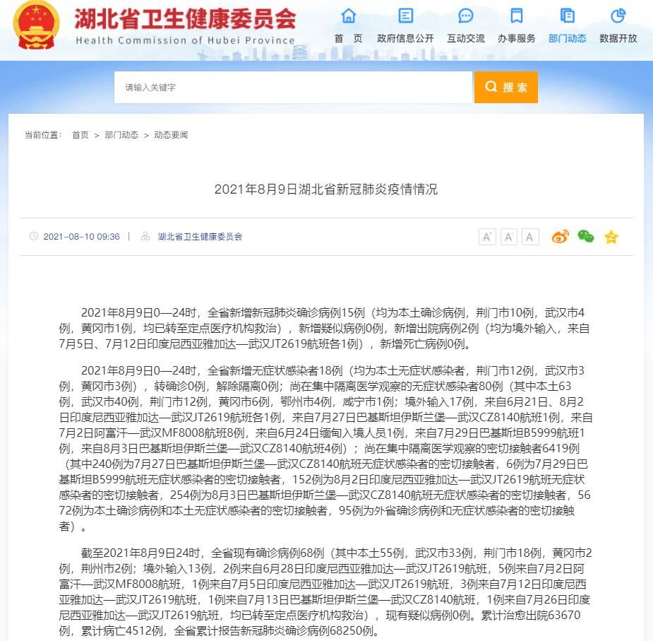 2021年8月9日0—24时,湖北省新增无症状感染者18例(均为本土无症状感染者,荆门市12例,武汉市3例,黄冈市3例),转确诊0例,解除隔离0例;尚在集中隔离医学观察的无症状感染者80例(其中本土63例,武汉市40例,荆门市12例,黄冈市6例,鄂州市4例,咸宁市1例;境外输入17例,来自6月21日、8月2日印度尼西亚雅加达—武汉JT2619航班各1例,来自7月27日巴基斯坦伊斯兰堡—武汉CZ8140航班1例,来自7月2日阿富汗—武汉MF8008航班8例,来自6月24日缅甸入境人员1例,来自7月29日巴基斯坦B5999航班1例,来自8月3日巴基斯坦伊斯兰堡—武汉CZ8140航班4例);尚在集中隔离医学观察的密切接触者6419例(其中240例为7月27日巴基斯坦伊斯兰堡—武汉CZ8140航班无症状感染者的密切接触者,6例为7月29日巴基斯坦B5999航班无症状感染者的密切接触者,152例为8月2日印度尼西亚雅加达—武汉JT2619航班无症状感染者的密切接触者,254例为8月3日巴基斯坦伊斯兰堡—武汉CZ8140航班无症状感染者的密切接触者,5672例为本土确诊病例和本土无症状感染者的密切接触者,95例为外省确诊病例和无症状感染者的密切接触者)。