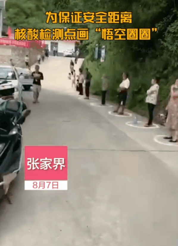 8月7日,湖南张家界一核酸检测点外,为保持安全距离,市民站在粉笔画的圆圈内排队,每个圆圈相隔一米。