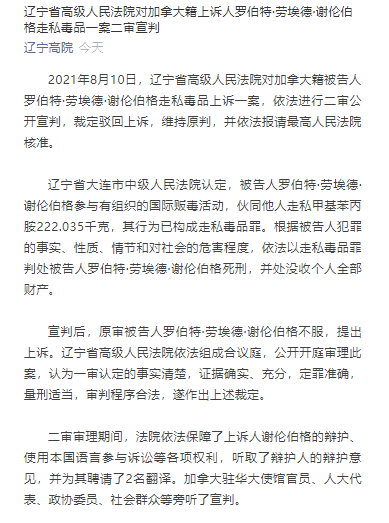 荔枝新闻讯 据辽宁高院官微消息,2021年8月10日,辽宁省高级人民法院对加拿大籍被告人罗伯特·劳埃德·谢伦伯格走私毒品上诉一案,依法进行二审公开宣判,裁定驳回上诉,维持原判,并依法报请最高人民法院核准。