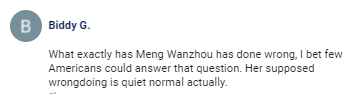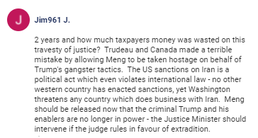 也有网友直言,扣押孟晚舟是加拿大犯下的“可怕错误”。这位网友写道:“特鲁多和加拿大犯了一个可怕的错误,为了特朗普的强盗战略,允许孟被扣押为人质。美国对伊朗的制裁是一种政治行为,甚至违反了国际法……既然罪犯特朗普和他的帮凶不再掌权,孟晚舟现在应该被释放,如果法官做出有利于引渡的裁决,加拿大司法部长应该进行干预。”↓