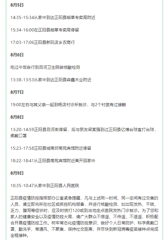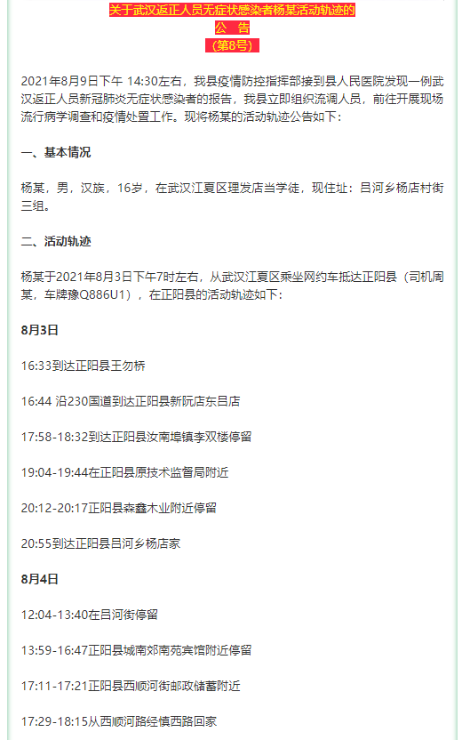 2021年8月9日下午 14:30左右,正阳县疫情防控指挥部接到县人民医院发现一例武汉返正人员新冠肺炎无症状感染者的报告,我县立即组织流调人员,前往开展现场流行病学调查和疫情处置工作。现将杨某的活动轨迹公告如下: