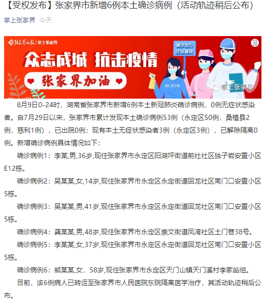 荔枝新闻讯 据“掌上张家界”微信号消息,8月9日0-24时,湖南省张家界市新增6例本土新冠肺炎确诊病例,0例无症状感染者。自7月29日以来,张家界市累计发现本土确诊病例53例(永定区50例,桑植县2例,慈利1例),已出院0例;现有本土无症状感染者3例(永定区3例),已解除隔离0例。新增确诊病例具体情况如下: