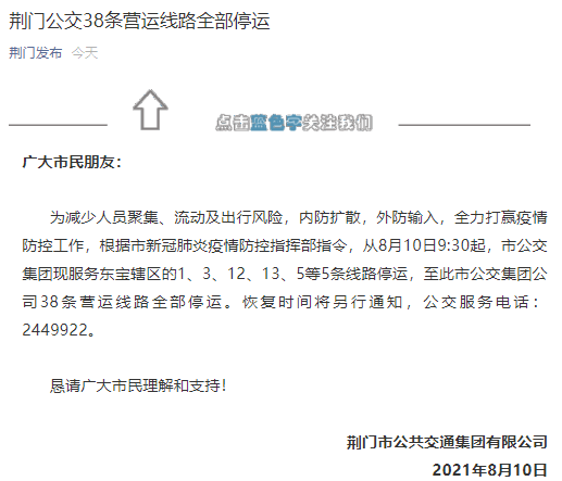 荔枝新闻讯 据微信公众号“荆门发布”10日消息,为减少人员聚集、流动及出行风险,内防扩散,外防输入,全力打赢疫情防控工作,根据市新冠肺炎疫情防控指挥部指令,从8月10日9:30起,市公交集团现服务东宝辖区的1、3、12、13、5等5条线路停运,至此市公交集团公司38条营运线路全部停运。恢复时间将另行通知,公交服务电话:2449922。