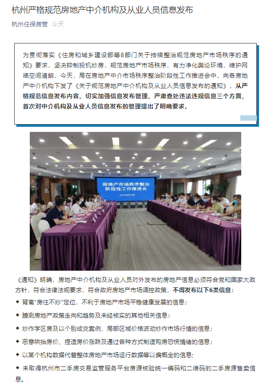荔枝新闻讯 据“杭州住保房管”微信号消息,为贯彻落实《住房和城乡建设部等8部门关于持续整治规范房地产市场秩序的通知》要求,坚决抑制投机炒房,规范房地产市场秩序,有力净化舆论环境,维护网络空间清朗,今天,在房地产中介市场秩序整治阶段性工作推进会中,杭州市住房保障和房产管理局向各房地产中介机构下发了《关于规范房地产中介机构及从业人员信息发布的通知》,从严格规范信息发布内容、切实加强信息发布管理、严肃查处违法违规信息三个方面,首次对中介机构及从业人员信息发布的管理提出了明确要求。