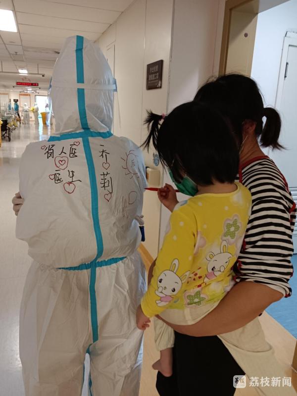 小患者在医护人员防护服上画爱心和太阳