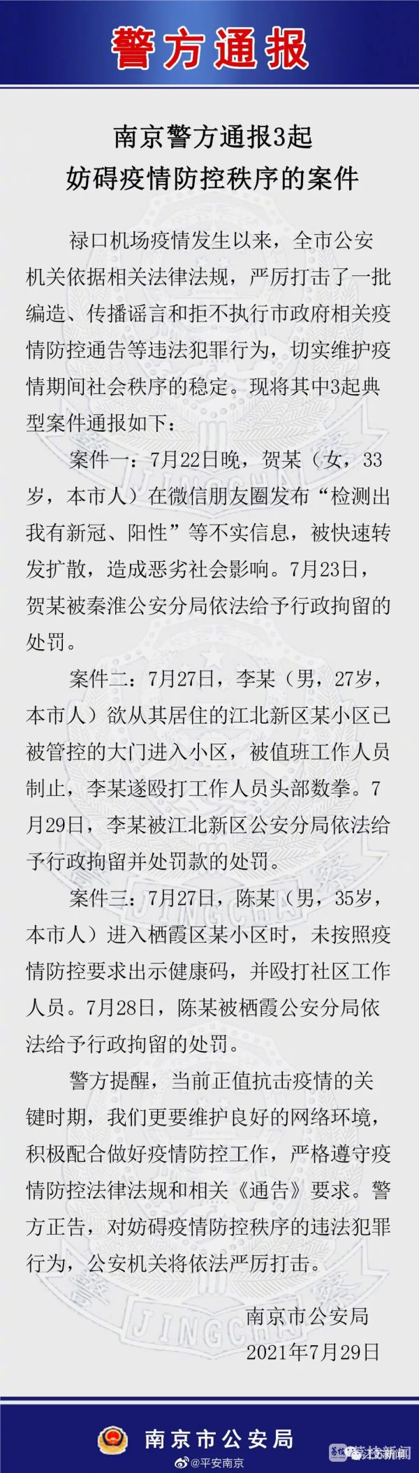 此外疫情期间, 以暴力、威胁方式阻碍疫情防控工作偶有发生,7月27日,李某欲从江北新区某小区已被管控的大门进入小区,被值班工作人员制止,李某遂打击工作人员头部数拳。7月29日,李某被江北新区公安分局依法给予行政拘留并处罚款的处罚。7月27日,陈某进入栖霞区某小区时,未按照疫情防控要求出示健康码,并殴打社区工作人员。7月28日,陈某被栖霞公安分局依法给予行政拘留的处罚。