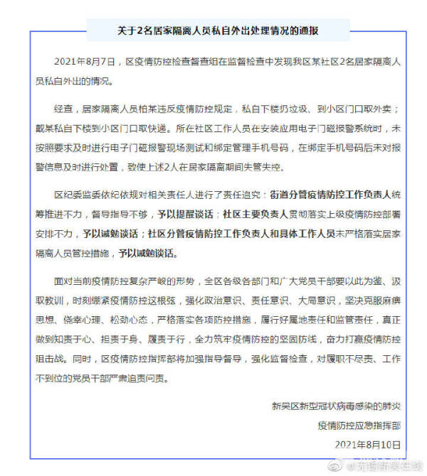 8月7日,无锡市新吴区疫情防控检查督查组在监督检查中发现当地某社区2名居家隔离人员私自外出的情况。今天(8月10日),“无锡新吴在线”对相关情况进行了通报: