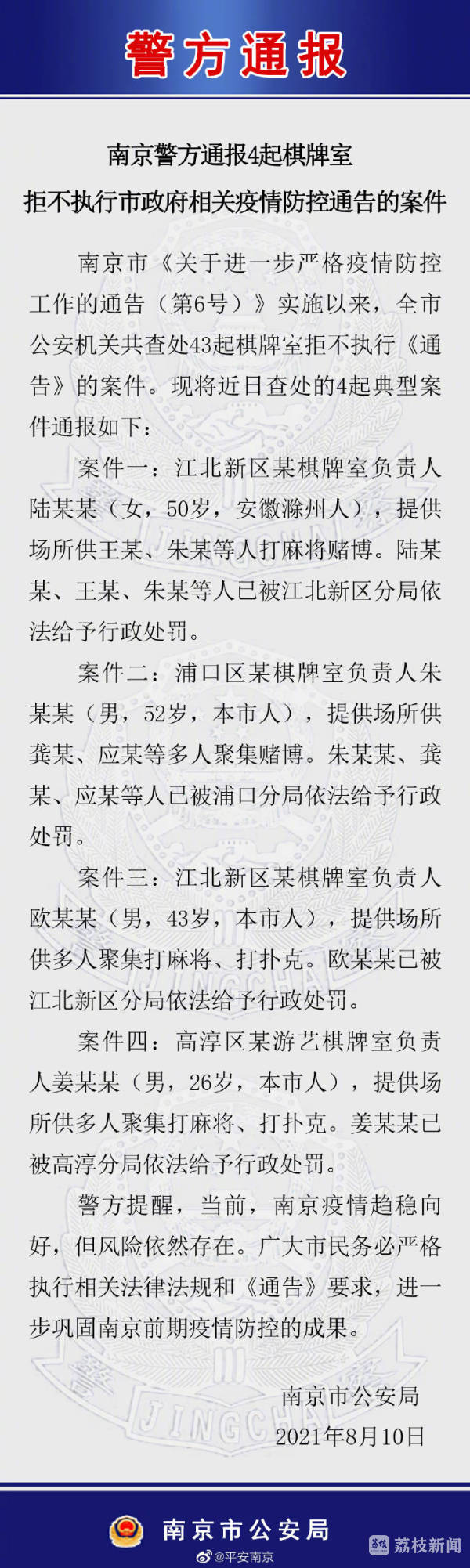 南京市《关于进一步严格疫情防控工作的通告(第6号)》实施以来,全市公安机关共查处43起棋牌室拒不执行《通告》的案件。南京市公安局今天(8月10日)将近日查处的4起典型案件进行了通报: