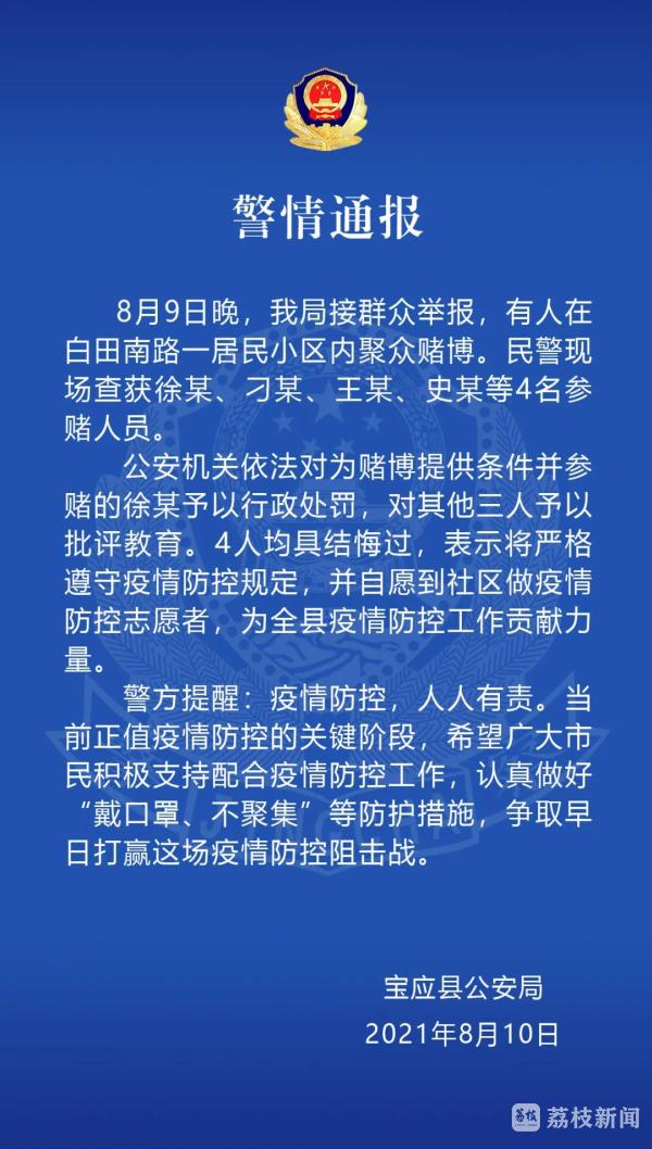 8月9日晚,扬州市宝应县公安局接群众举报,有人在白田南路一居民小区内聚众赌博。民警立即进行了查处,对为赌博提供条件并参赌的徐某予以行政处罚,对其他三人予以批评教育。