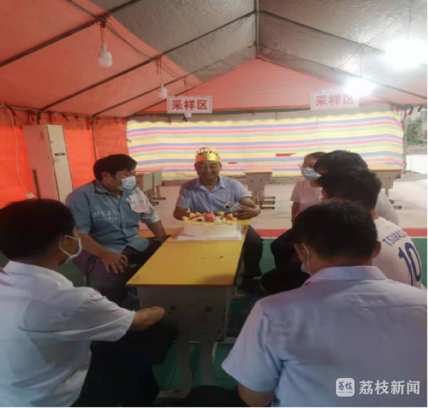 “祝你生日快乐,祝你生日快乐!”8月10日上午,老党员陈裕在扬州高邮市卸甲镇龙奔村核酸检测采样点度过了一个特殊的六十岁生日,他最大的生日愿望是“高邮平安”。