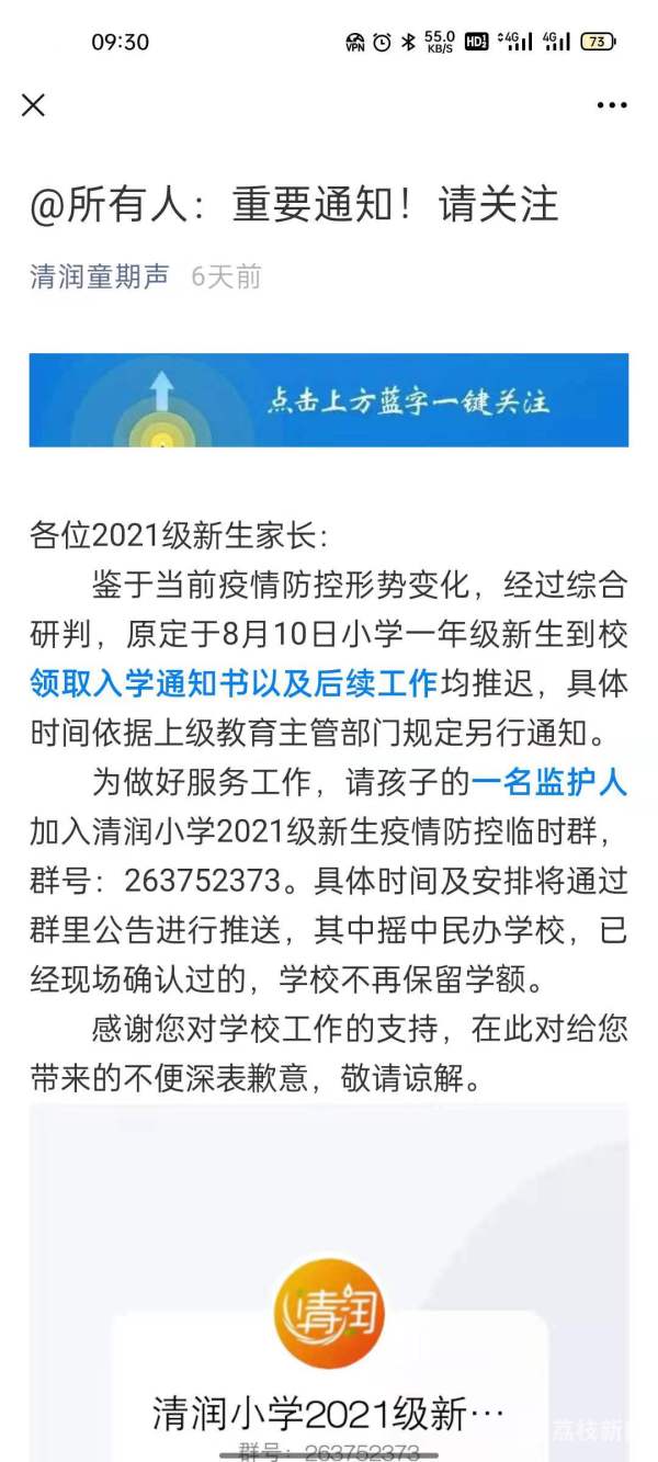在南京市清润小学微信公众号上,写着“原定8月10日小学一年级新生到校领取入学通知书以及后续工作均推迟”。