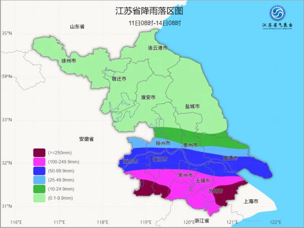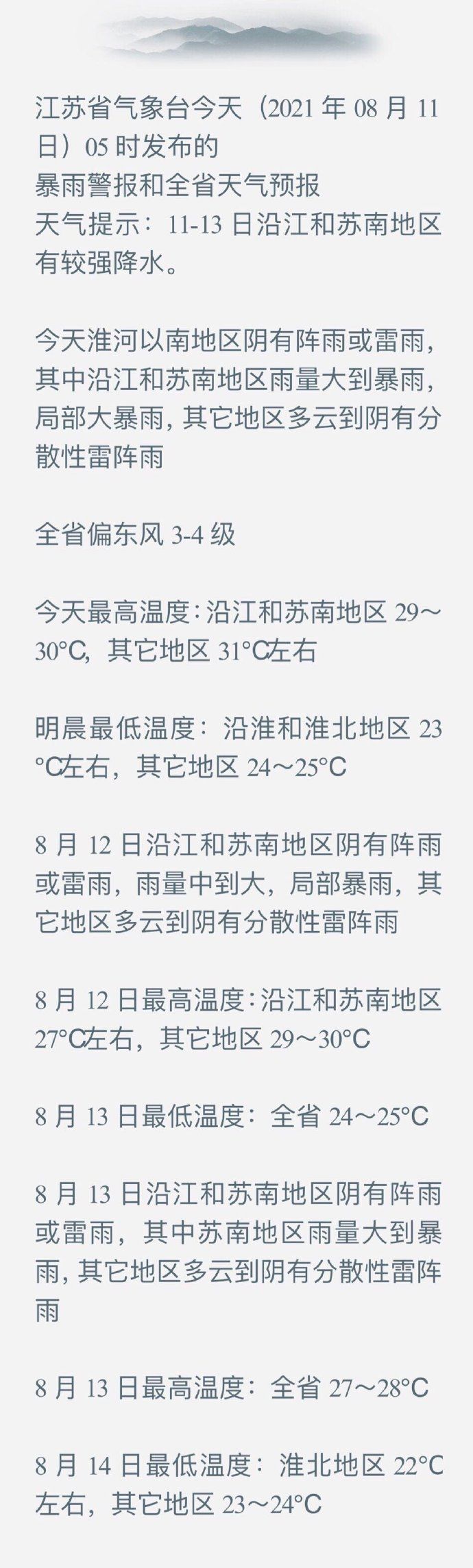 11日 沿江和苏南地区阴有阵雨或雷雨,雨量大到暴雨、局部大暴雨,其它地区多云到阴有阵雨或雷雨。