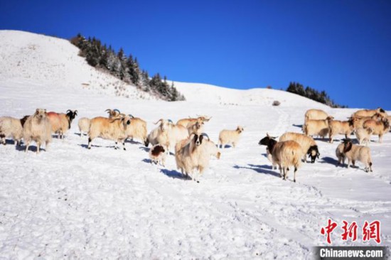 2018年4月初,祁连山雪后风光旖旎。图为雪地里的羊群。(资料图) 武雪峰 摄