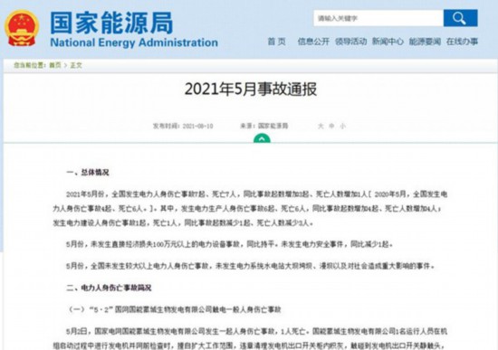 中国网财经8月11日讯(记者钟文鑫) 据国家能源局网站消息,2021年5月份,全国发生电力人身伤亡事故7起、死亡7人,同比事故起数增加3起、死亡人数增加1人。其中,发生电力生产人身伤亡事故6起、死亡6人,同比事故起数增加4起、死亡人数增加4人;发生电力建设人身伤亡事故1起,死亡1人,同比事故起数减少1起、死亡人数减少3人。