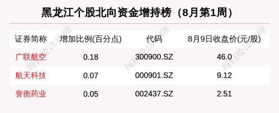 再看北向资金,8月第1周,广联航空北向资金持股比例增加0.18个百分点,航天科技北向资金持股比例增加0.07个百分点,誉衡药业北向资金持股比例增加0.05个百分点。
