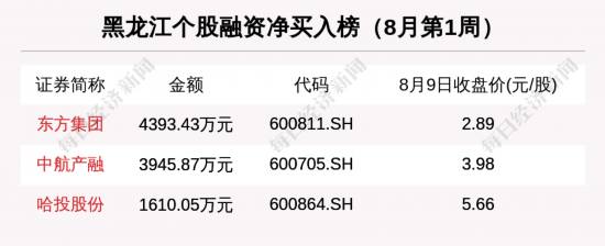 先看融资资金,8月第1周,黑龙江板块融资净偿还总额为4.35亿元。融资净买入最多的黑龙江股是东方集团,金额是4393.43万元。其次是中航产融(3945.87万元)和哈投股份(1610.05万元)。