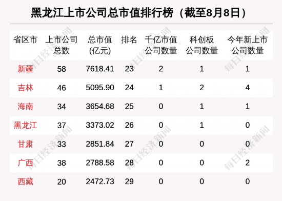 据统计,与海南相比,黑龙江上市公司总数比海南多3家;千亿市值公司数量与海南持平;科创板公司数量与海南持平;今年新上市公司数量比海南少1家。