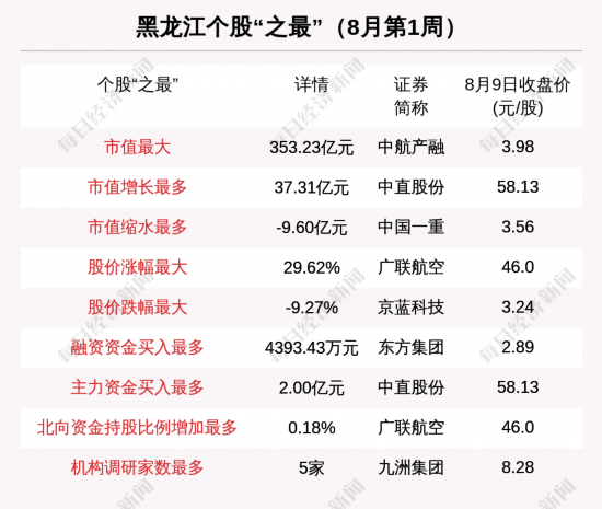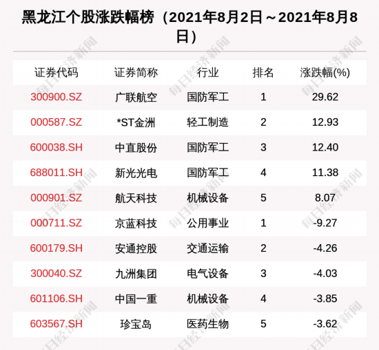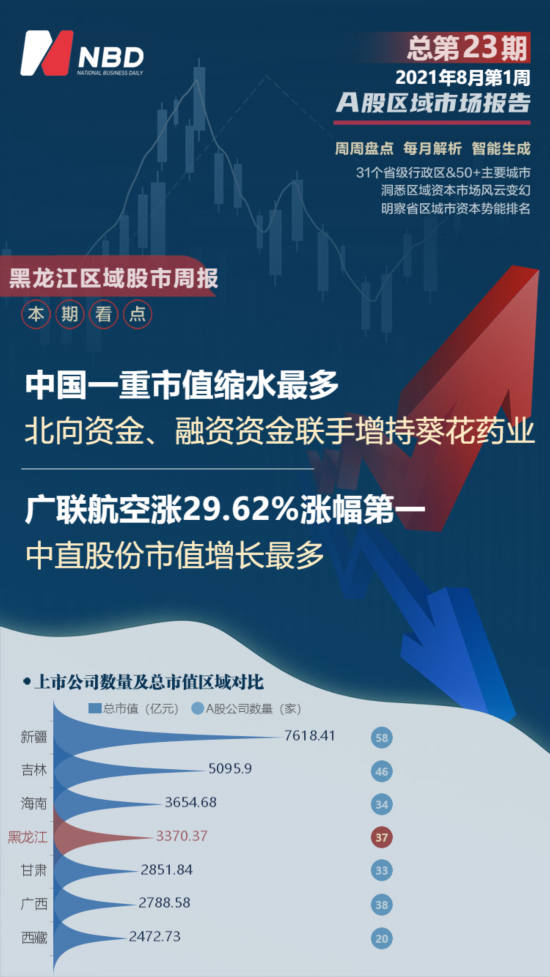 8月第1周(2021年8月2日~2021年8月8日),黑龙江股中,中直股份市值增长最多;中国一重市值缩水最多;涨幅最大的是广联航空,上涨幅度为29.62%;跌幅最大的是京蓝科技。