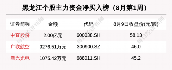 主力资金方面,8月第1周,中直股份净买入额居首位,为2.00亿元,其次是广联航空(9276.51万元)和新光光电(1075.42万元)。