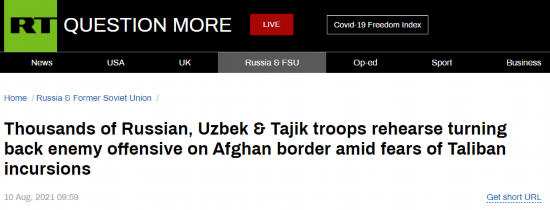 阿富汗局势持续紧张。“今日俄罗斯”(RT)10日报道称,在塔吉克斯坦境内举行的俄罗斯、乌兹别克斯坦、塔吉克斯坦三国联合军演当天仍在进行之中,该演习目的旨在确保美国撤军后相关国家与阿富汗边境地区的安全。