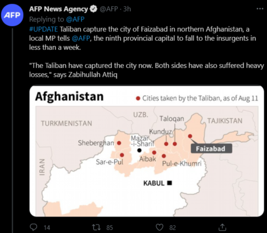 据法新社11日最新消息,塔利班目前已攻占阿富汗北部一省会城市法扎巴德,也是其在不到一周时间内攻占的第9座阿富汗省会城市。