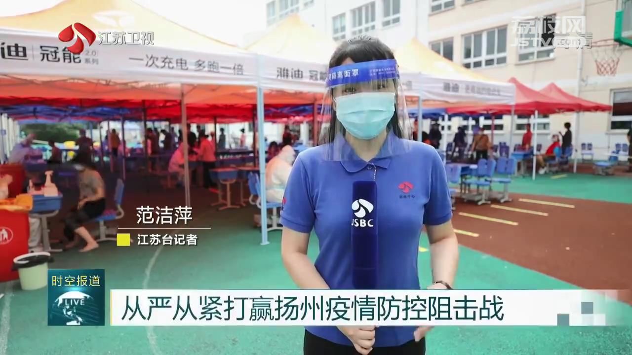 江苏台记者范洁萍说:“我现在是在扬州市广陵区汶河街道四望亭社区的核酸采样点。目前,这里的核酸采样工作正在进行。现场划分成三个区域,分别是缓冲区、登记区和采样区,居民们按照一米的间隔排队等候。”