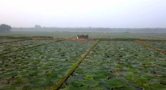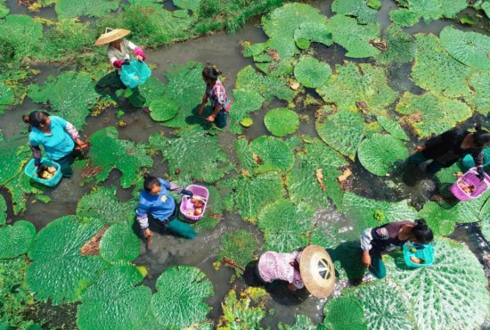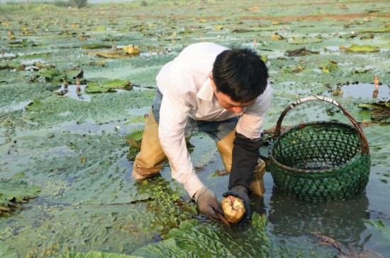 而且采摘也是个体力活,水塘里淤泥黏腻,难以移动,需要在果实根部连续三刀,果实才顺利采摘下来,这样3个人连续劳作5个小时,才能采摘500斤鸡头米苞。