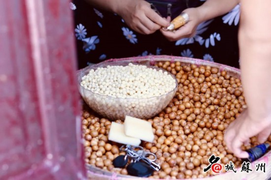 特有的苏氏小吃糖粥,里面再加上鸡头米,让原本一碗普通的糖粥有了另一番味道。鸡头米和软糯的元宵一起在唇齿间碰撞,让人心生摇曳。