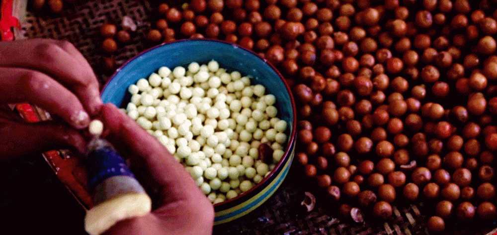 其次是筛选优质鸡头米苞,去皮分籽,清洗干净。