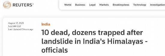 据路透社介绍,7月下旬,该邦的金瑙尔地区有至少9人在一次山体滑坡中丧生。此外,近期喜马偕尔邦另一个地区有数十人因山体滑坡和洪水而受困。路透社称,喜马偕尔邦毗邻喜马拉雅山脉,风景优美,很受游客欢迎。