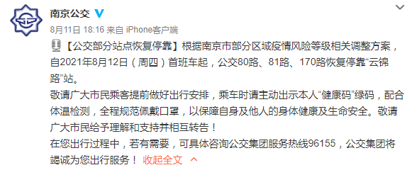 据@南京公交 8月11日消息,根据南京市部分区域疫情风险等级相关调整方案,自2021年8月12日(周四)首班车起,公交80路、81路、170路恢复停靠“云锦路”站。
