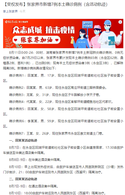 荔枝新闻讯 据“掌上张家界”微信公众号消息,8月11日0:00-24:00时,湖南省张家界市新增7例本土新冠肺炎确诊病例,0例无症状感染者。自7月29日以来,张家界市累计发现本土确诊病例65例(永定区62例,桑植县2例,慈利1例),已出院0例;现有本土无症状感染者3例(永定区3例),已解除隔离0例。新增确诊病例具体情况如下: