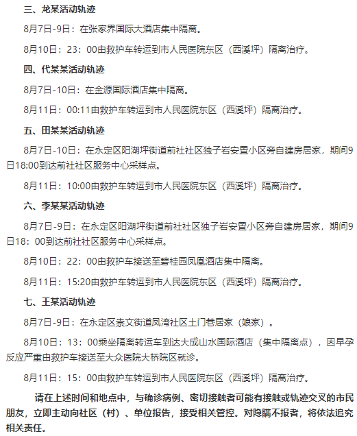 三、龙某活动轨迹8月7日-9日:在张家界国际大酒店集中隔离。8月10日:23:00由救护车转运到市人民医院东区(西溪坪)隔离治疗。