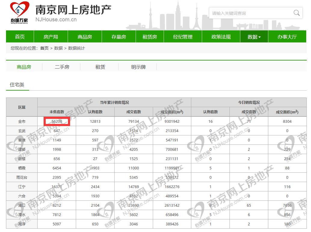8月10日14:00,记者登录南京网上房地产,数据显示当前南京新房库存已达56200套。按照南京房地产市场以往去化速度来看,一般新房库存处于四万套至五万套之间属于正常情况,超过五万套说明库存高位。