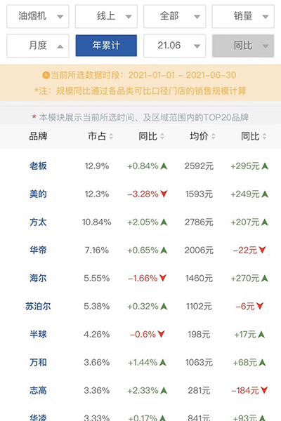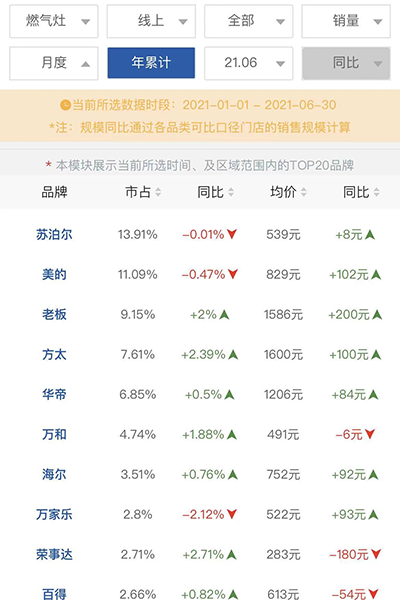 奥维云网显示,2021年1-6月,包括油烟机、燃气灶、热水器、洗碗机、集成灶等在内的8个厨电品类,零售额和零售量规模同比去年有较大幅度增长。华帝、方太、老板在内的整个厨电企业经营情况均出现好转。