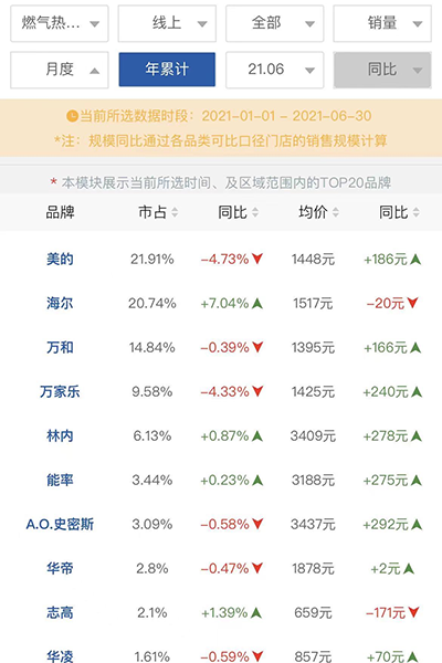 华帝产品上半年市场销量到底如何?以华帝今年主攻的线上渠道为例,第三方数据显示,截止上半年,华帝主营厨电产品(烟机、灶具以及热水器)线上销量市场占比均未超过10%,其中燃气热水器市场销量市场占比仅为2.8%。而华帝油烟机、燃气灶销量市场占比份额也已被美的赶超。