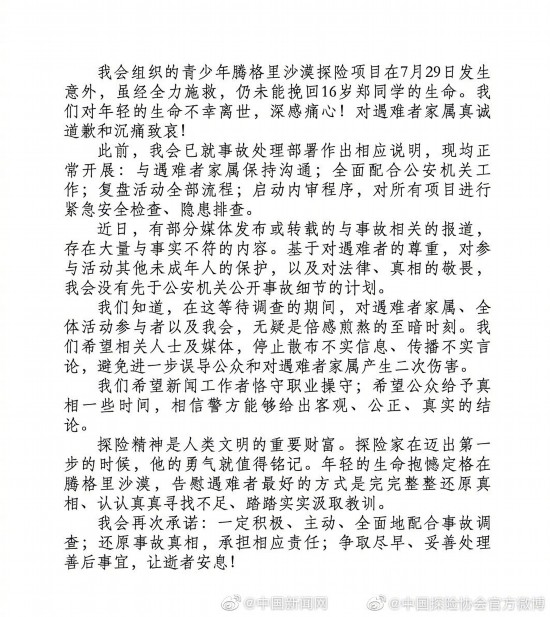 今天,中国探险协会官博发布公告,称7月29日在其组织的青少年腾格里沙漠探险项目中发生意外,16岁的郑同学离世。目前协会正与遇难者家属保持沟通,全面配合公安机关工作。
